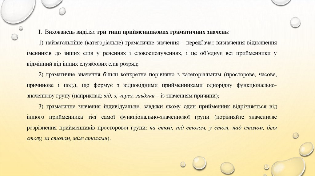 І. Вихованець виділяє три типи прийменникових граматичних значень:1) найзагальніше (категоріальне) граматичне значення – передбачає визначення відношення