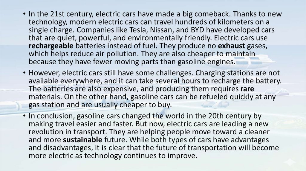 • In the 21st century, electric cars have made a big comeback. Thanks to newtechnology, modern electric cars can travel hundreds of kilometers on a