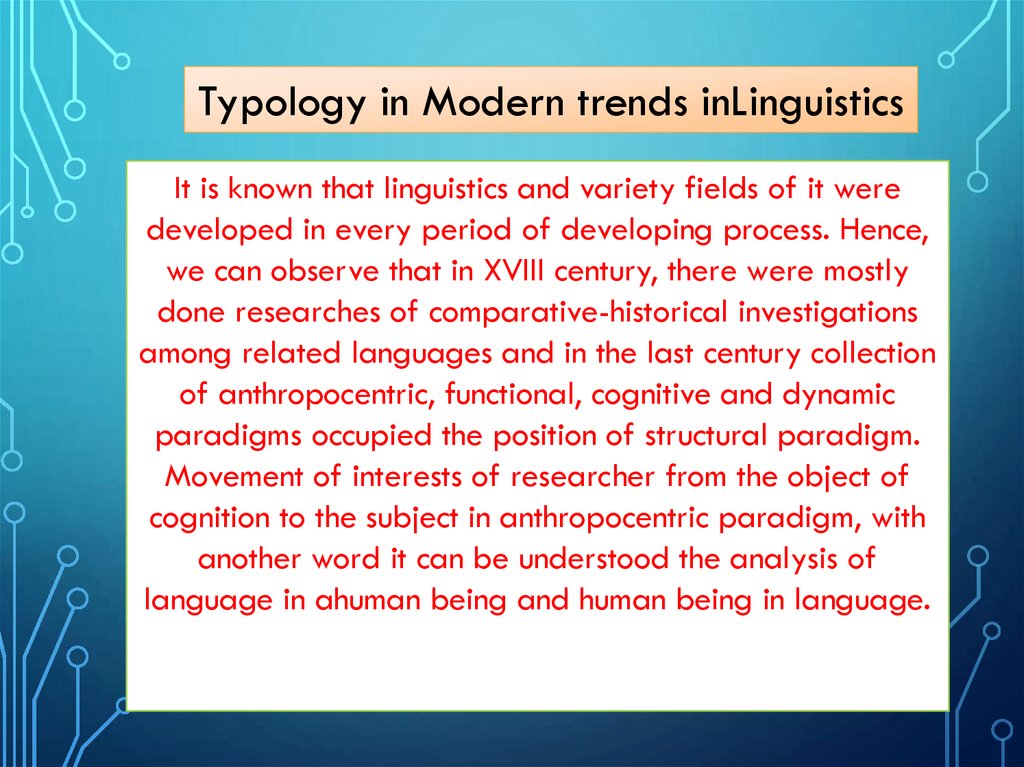 Typology in Modern trends inLinguisticsIt is known that linguistics and variety fields of it were