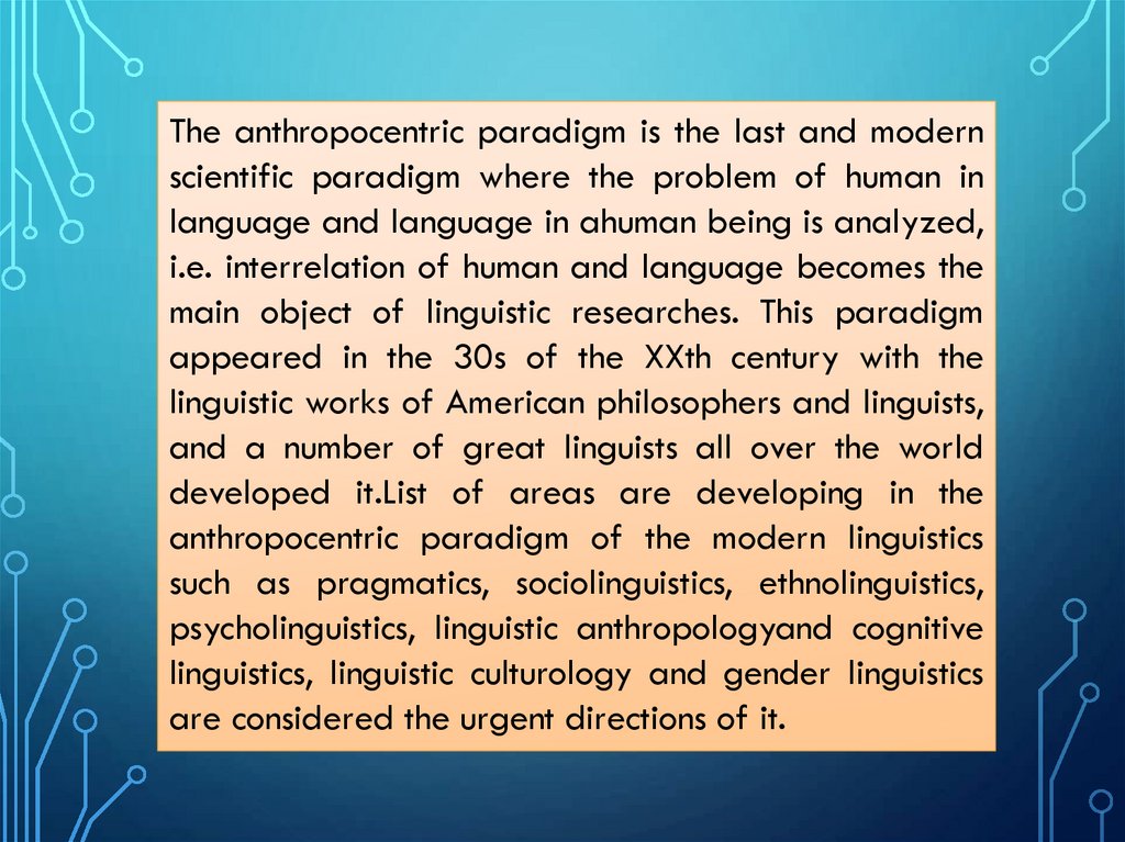 The anthropocentric paradigm is the last and modernscientific paradigm where the problem of human in