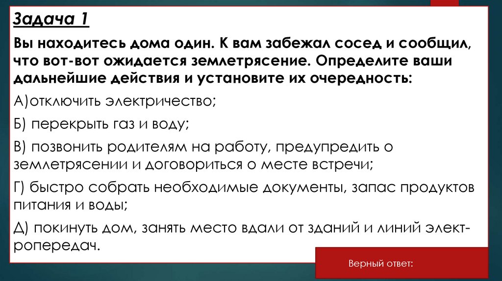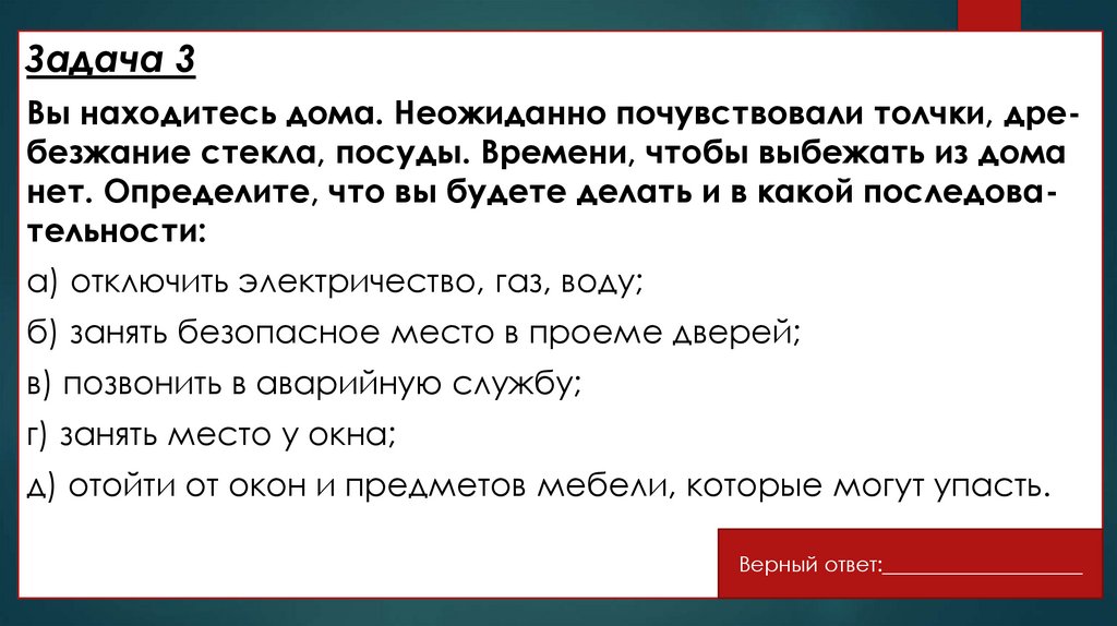 Задача 3Вы находитесь дома. Неожиданно почувствовали толчки, дребезжание стекла, посуды. Времени, чтобы выбежать из дома