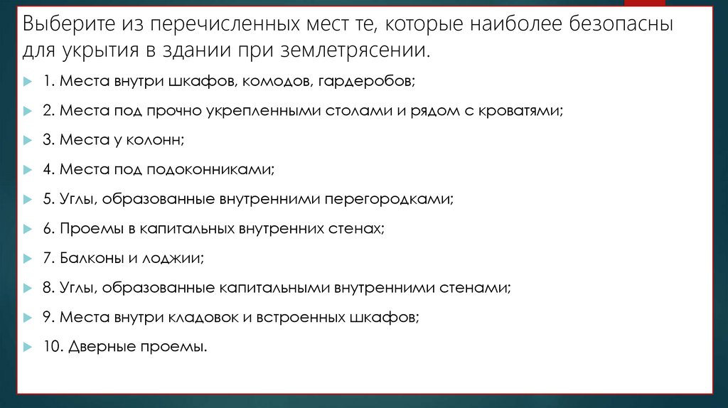 Выберите из перечисленных мест те, которые наиболее безопасныдля укрытия в здании при землетрясении.