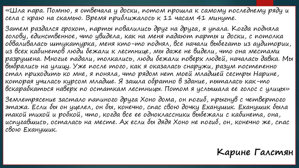 «Шла пара. Помню, я отвечала у доски, потом прошла к самому последнему ряду исела с краю на скамью. Время приближалось к 11 часам 41 минуте.