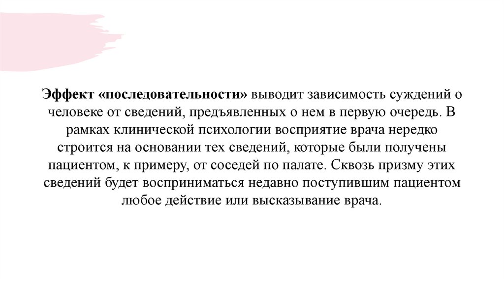 Эффект «последовательности» выводит зависимость суждений очеловеке от сведений, предъявленных о нем в первую очередь. В