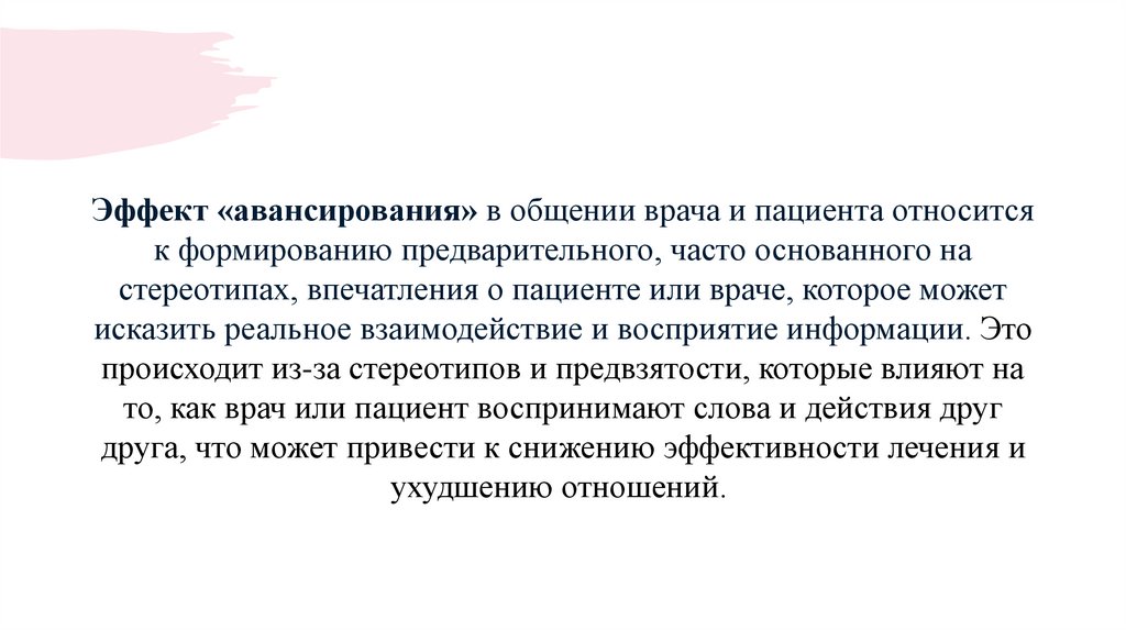 Эффект «авансирования» в общении врача и пациента относитсяк формированию предварительного, часто основанного на