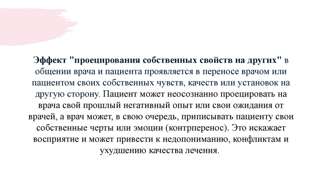 Эффект "проецирования собственных свойств на других" вобщении врача и пациента проявляется в переносе врачом или