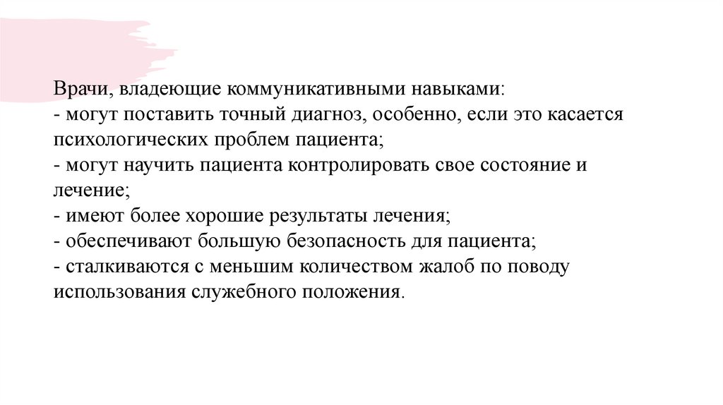 Врачи, владеющие коммуникативными навыками:- могут поставить точный диагноз, особенно, если это касается