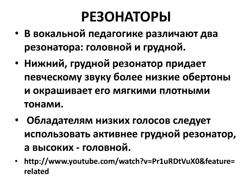 РЕЗОНАТОРЫ• В вокальной педагогике различают два