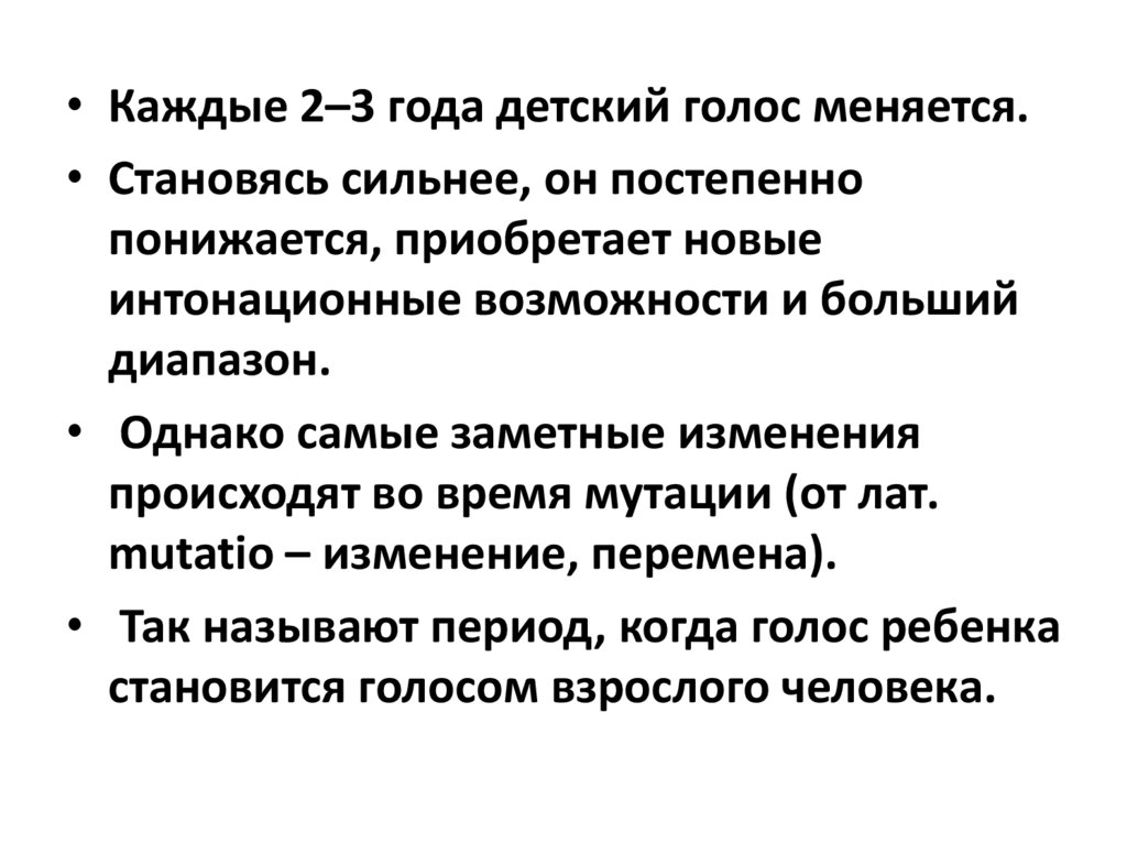 • Каждые 2–3 года детский голос меняется.• Становясь сильнее, он постепенно