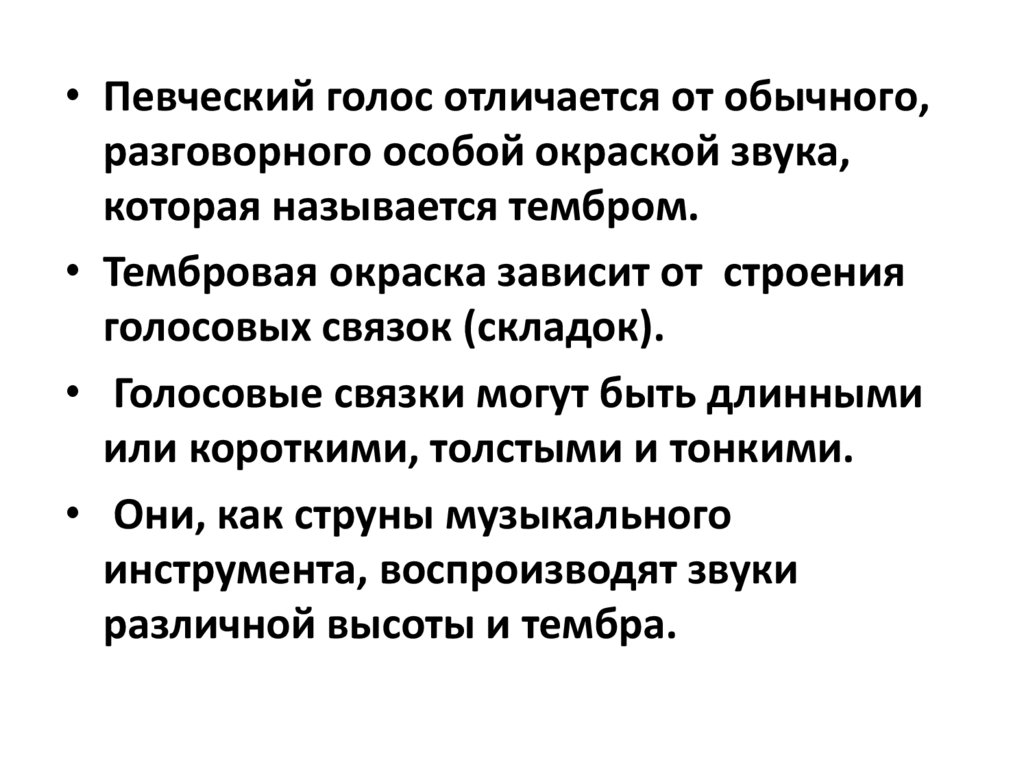 • Певческий голос отличается от обычного,разговорного особой окраской звука,