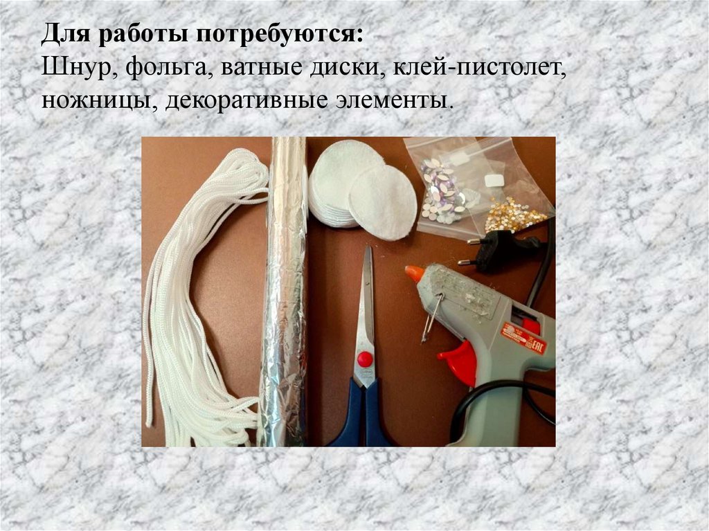 Для работы потребуются:Шнур, фольга, ватные диски, клей-пистолет,