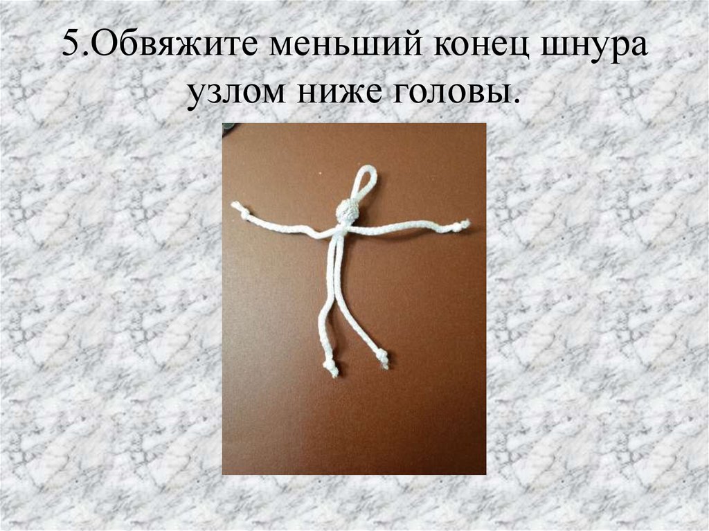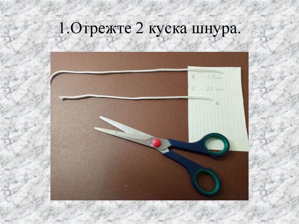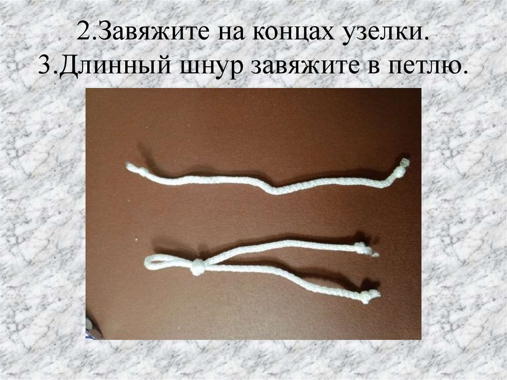 2.Завяжите на концах узелки.3.Длинный шнур завяжите в петлю.