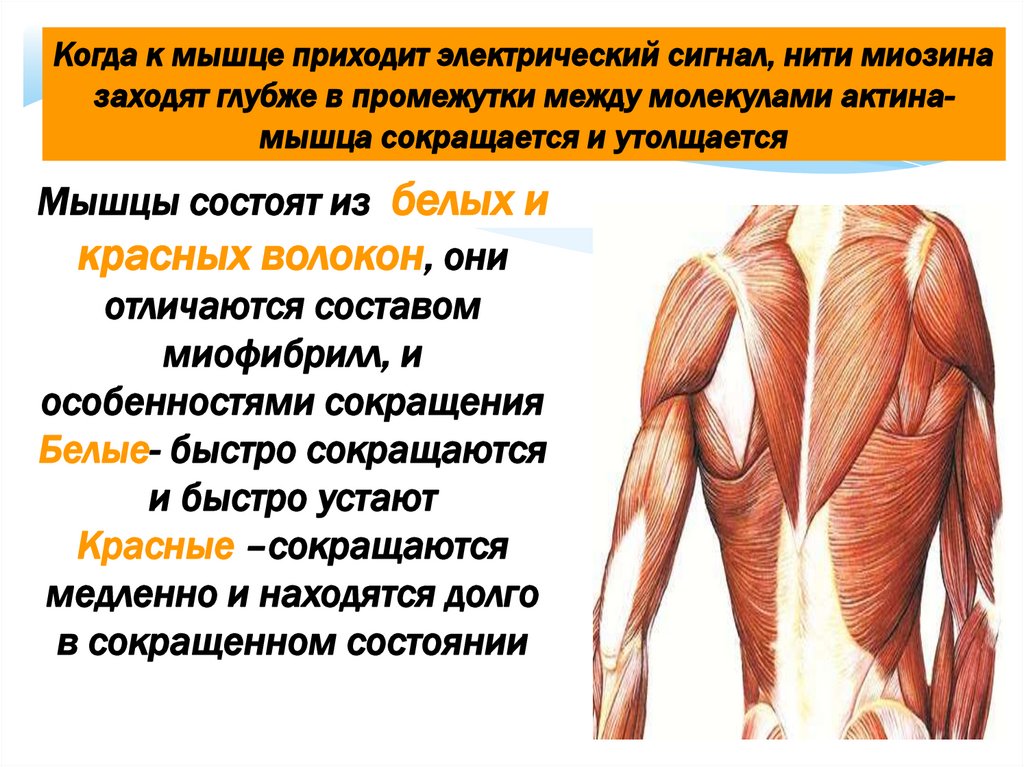 Когда к мышце приходит электрический сигнал, нити миозиназаходят глубже в промежутки между молекулами актинамышца сокращается и утолщается