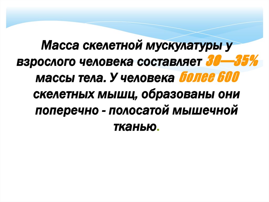 Масса скелетной мускулатуры увзрослого человека составляет 30—35%