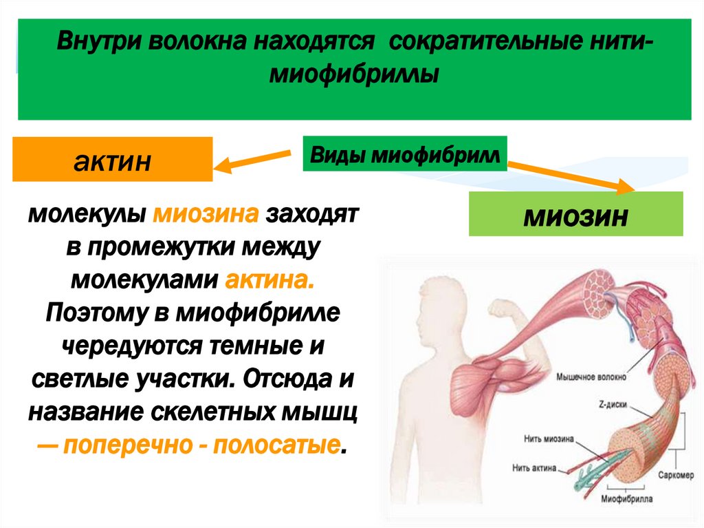 Внутри волокна находятся сократительные нитимиофибриллыактин