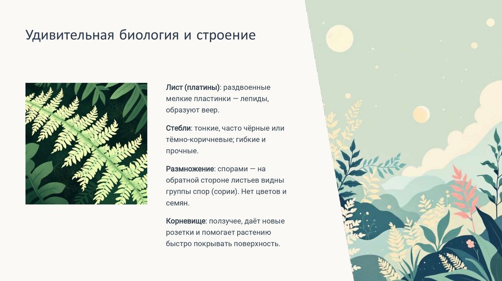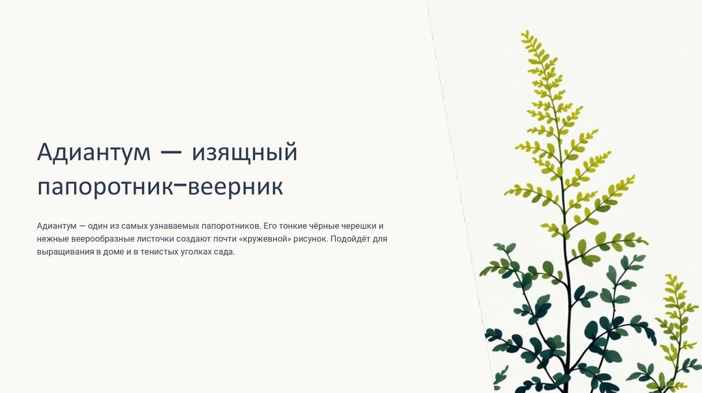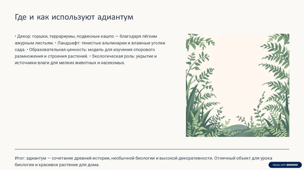 Итог: адиантум — сочетание древней истории, необычной биологии и высокой декоративности. Отличный объект для урока
