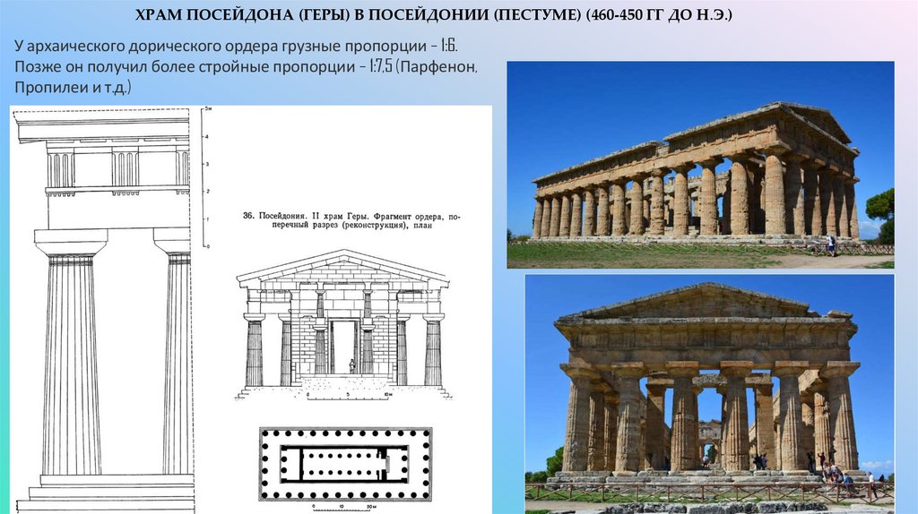 ХРАМ ПОСЕЙДОНА (ГЕРЫ) В ПОСЕЙДОНИИ (ПЕСТУМЕ) (460-450 ГГ ДО Н.Э.)У архаического дорического ордера грузные пропорции – 1:6.
