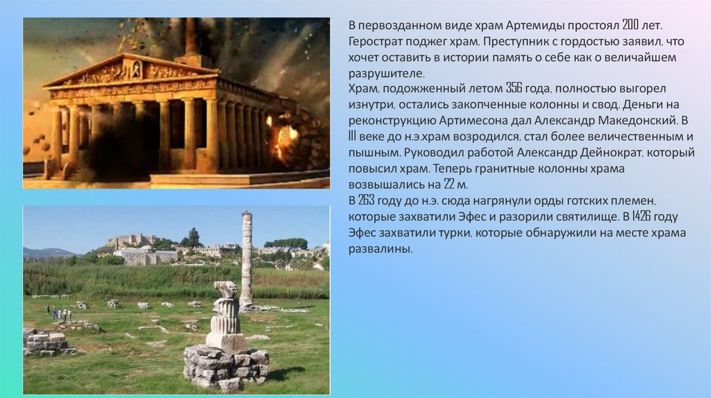 В первозданном виде храм Артемиды простоял 200 лет.Герострат поджег храм. Преступник с гордостью заявил, что