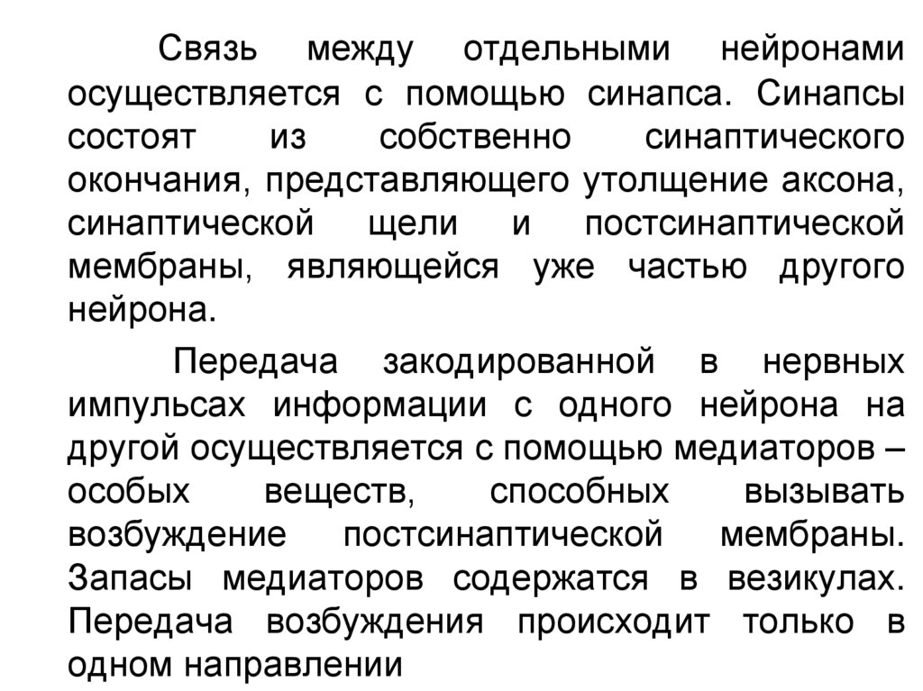Связь между отдельными нейронамиосуществляется с помощью синапса. Синапсы