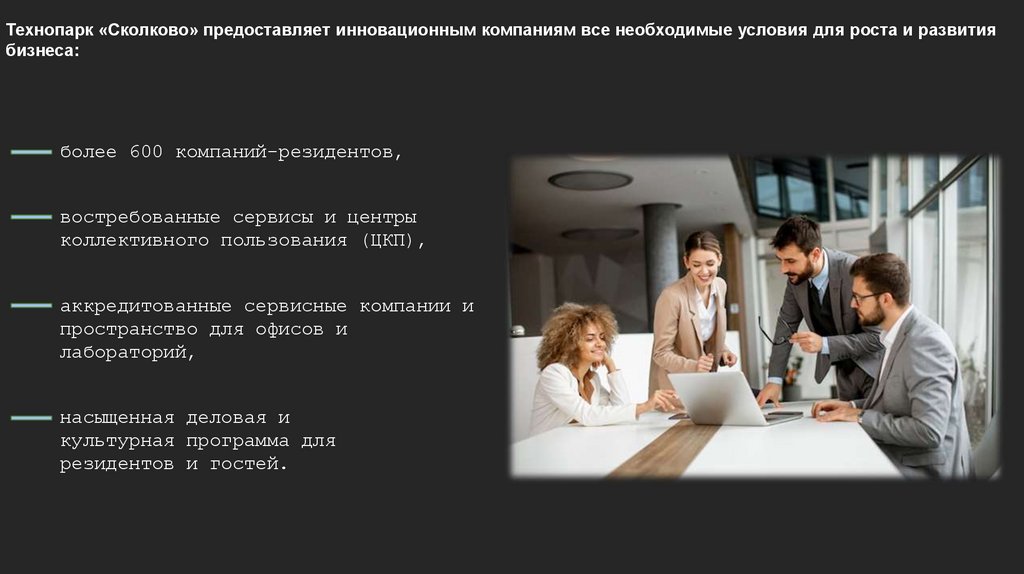 Технопарк «Сколково» предоставляет инновационным компаниям все необходимые условия для роста и развитиябизнеса: