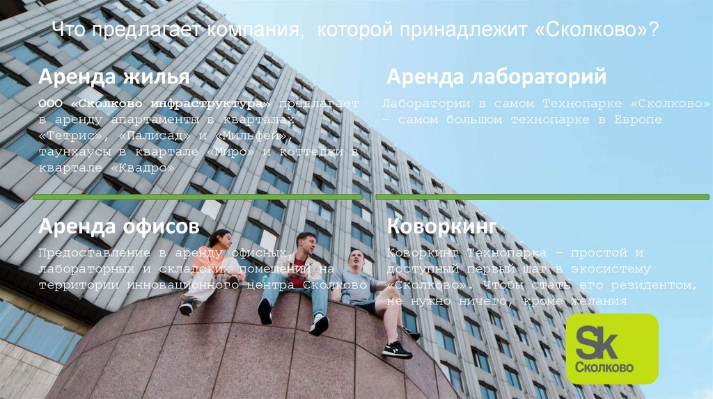 Что предлагает компания, которой принадлежит «Сколково»?Аренда жилья