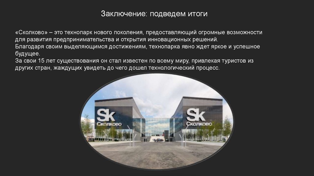 Заключение: подведем итоги«Сколково» – это технопарк нового поколения, предоставляющий огромные возможности