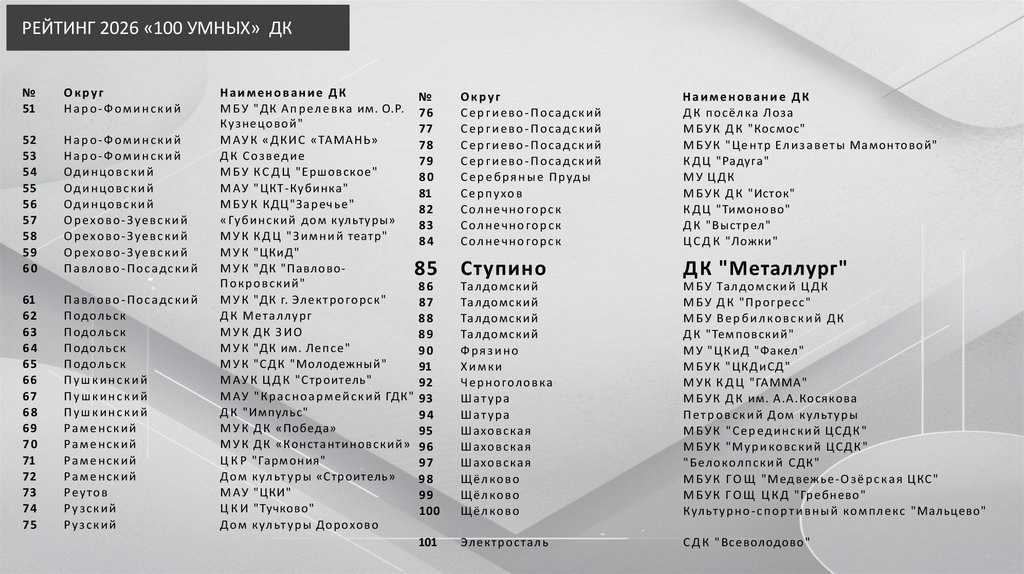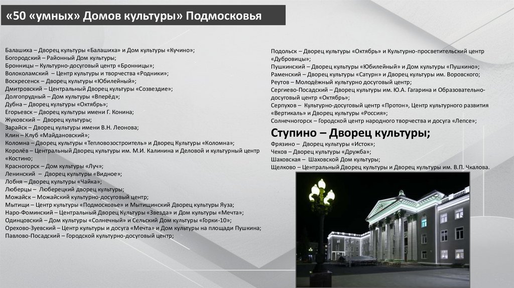 «50 «умных» Домов культуры» ПодмосковьяБалашиха – Дворец культуры «Балашиха» и Дом культуры «Кучино»;