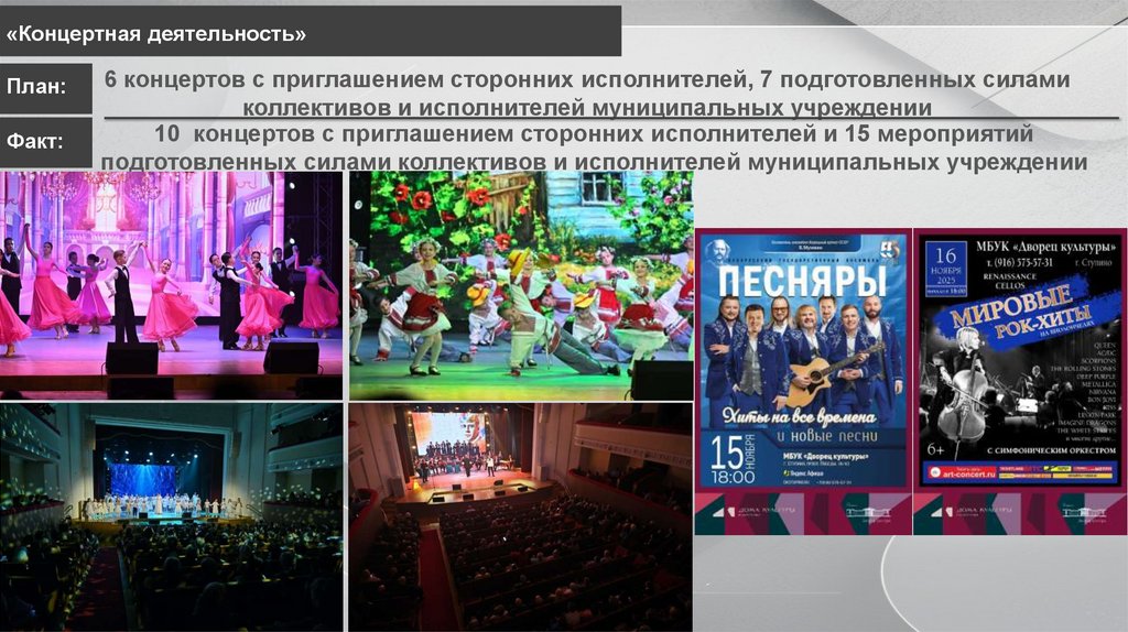 6 концертов с приглашением сторонних исполнителей, 7 подготовленных силами