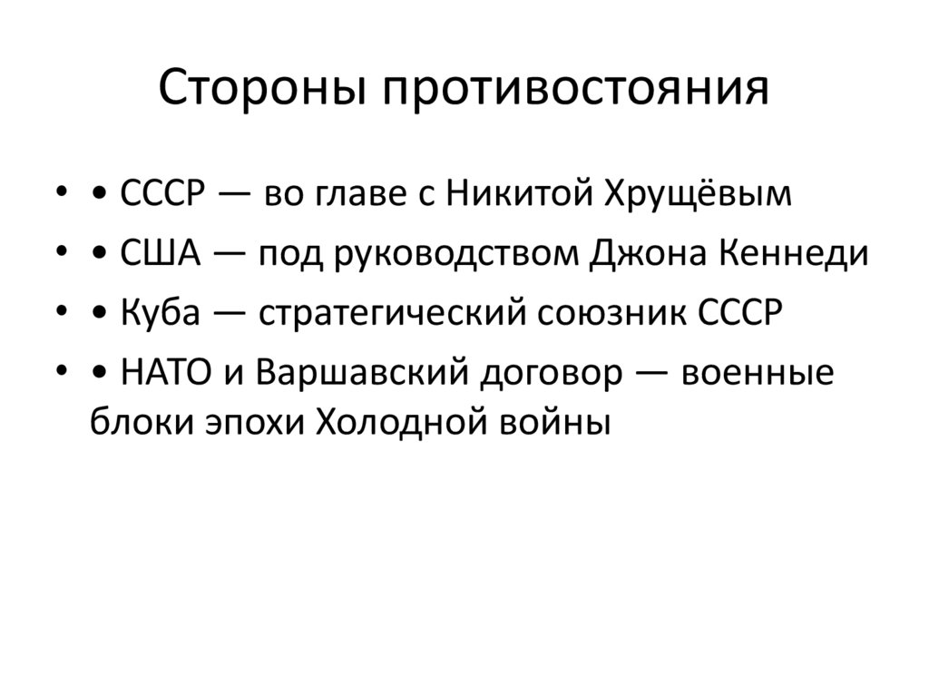 Стороны противостояния• • СССР — во главе с Никитой Хрущёвым
