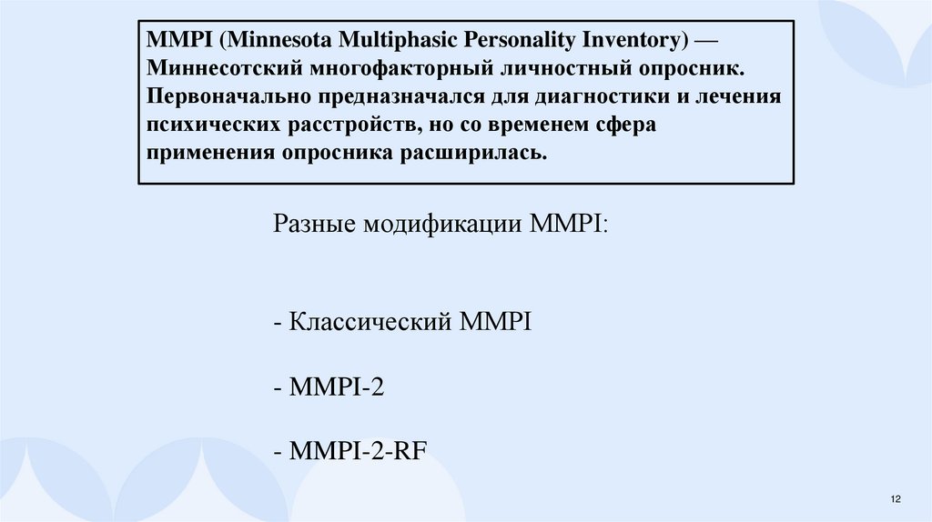 MMPI (Minnesota Multiphasic Personality Inventory) —Миннесотский многофакторный личностный опросник.