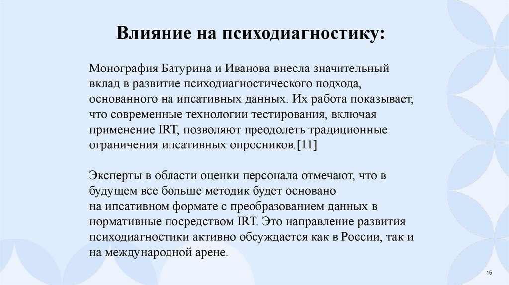 Влияние на психодиагностику:Монография Батурина и Иванова внесла значительный