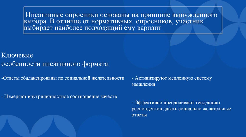 Ипсативные опросники основаны на принципе вынужденноговыбора. В отличие от нормативных опросников, участник