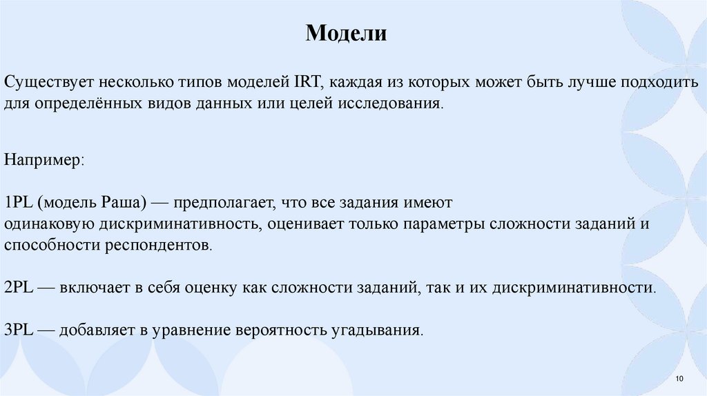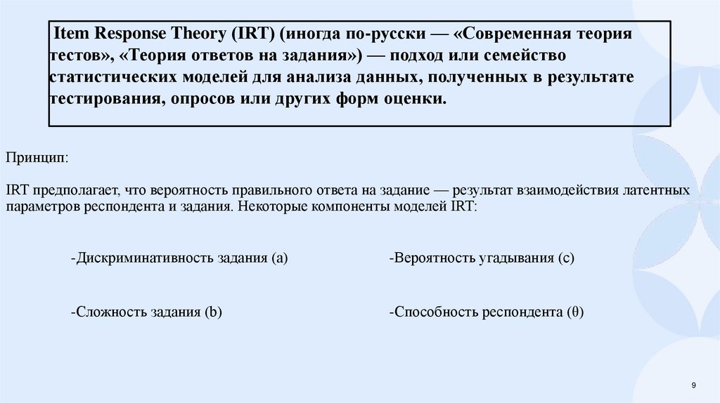 параметров респондента и задания. Некоторые компоненты моделей IRT: