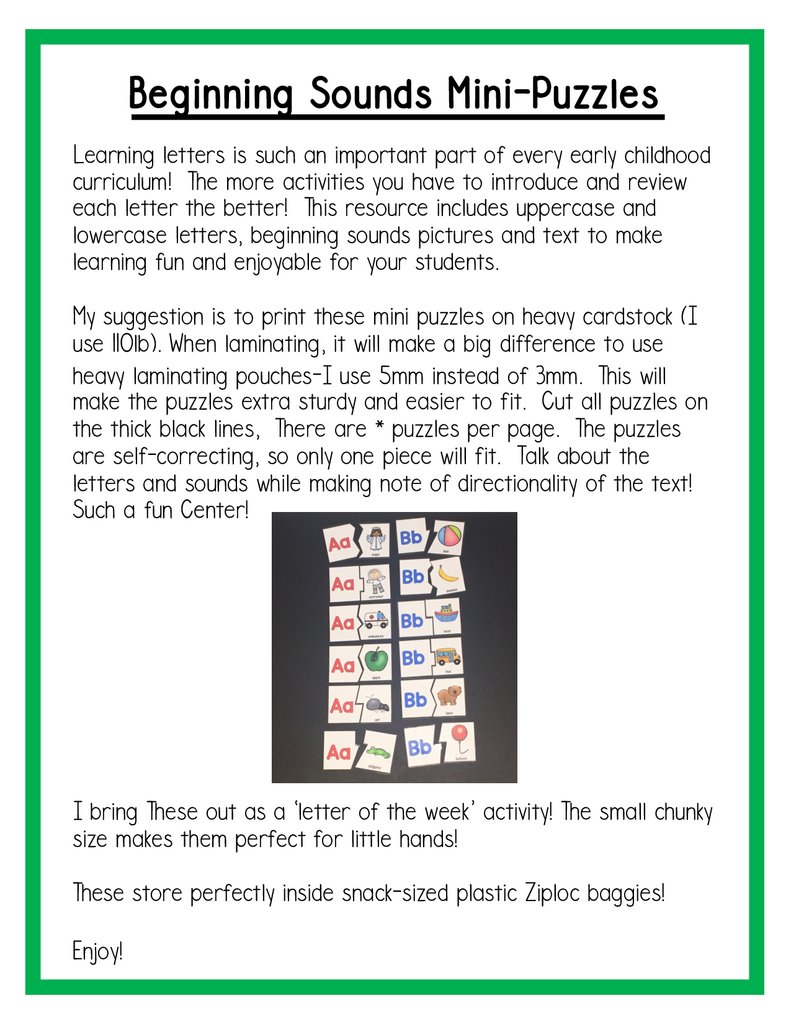The fun continues with beginning sounds mini-puzzles and 2 art/craft