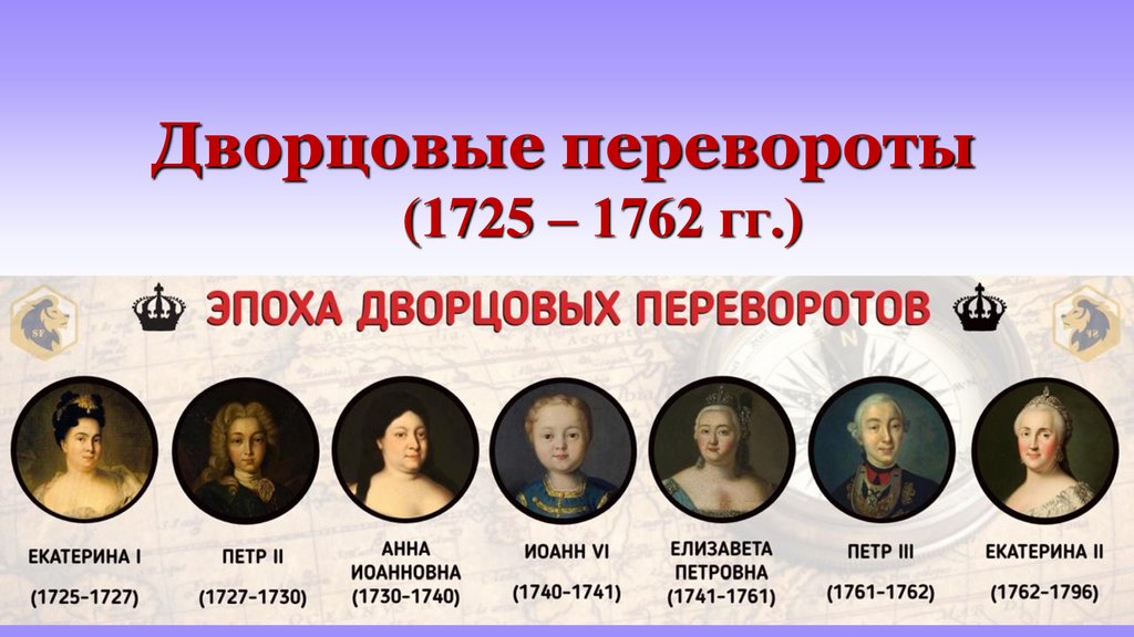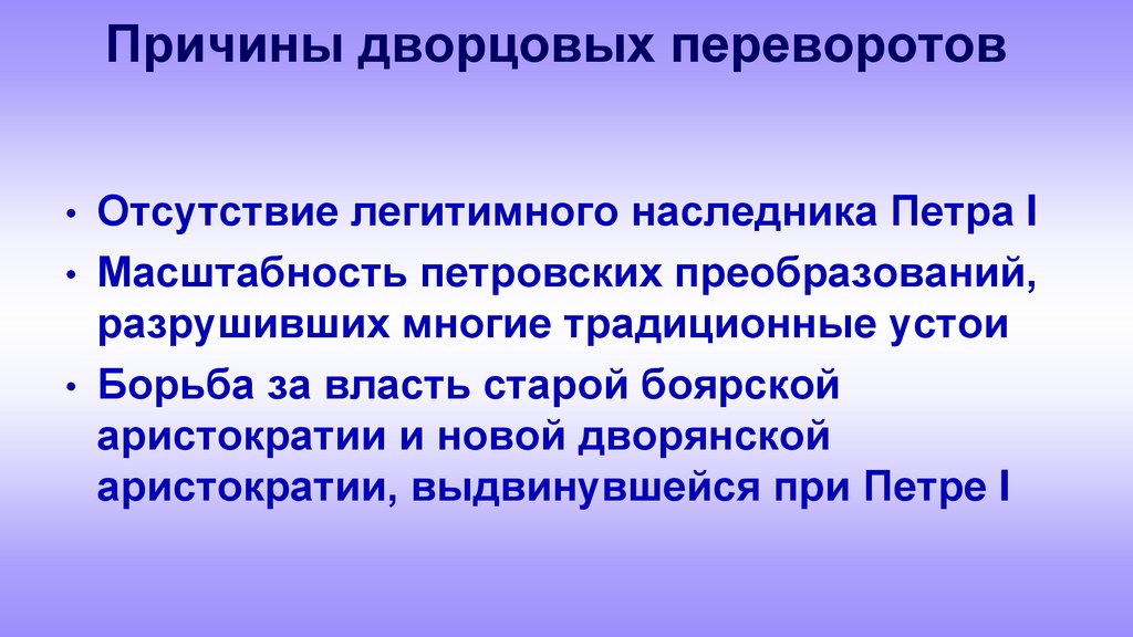 Причины дворцовых переворотов• Отсутствие легитимного наследника Петра I