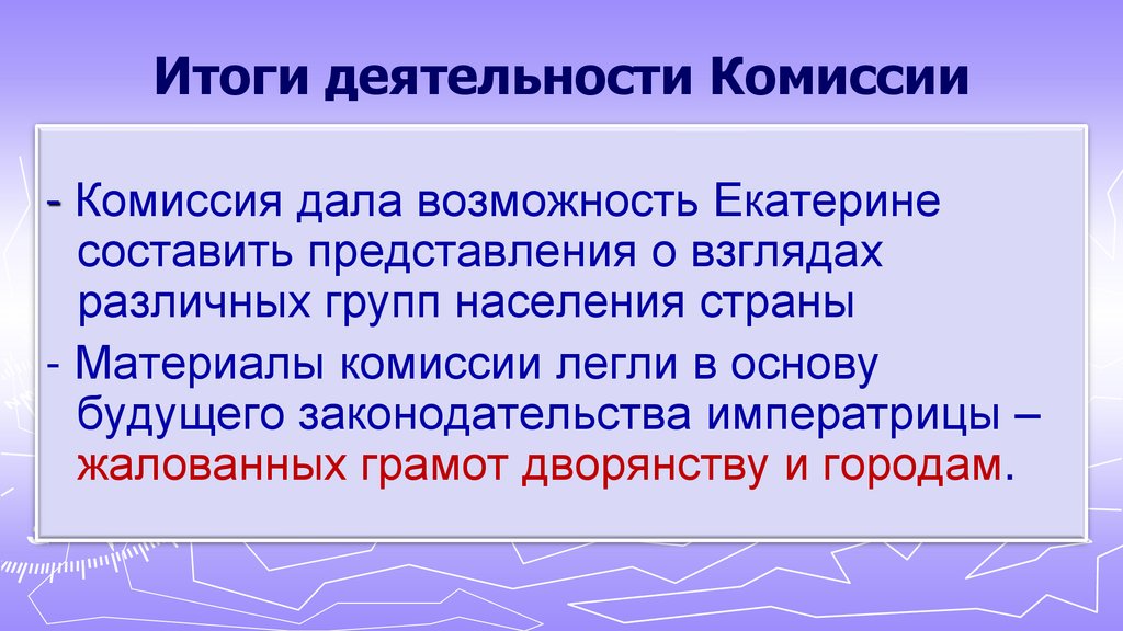 Итоги деятельности Комиссии- Комиссия дала возможность Екатерине