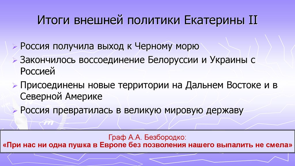 Итоги внешней политики Екатерины II➢ Россия получила выход к Черному морю