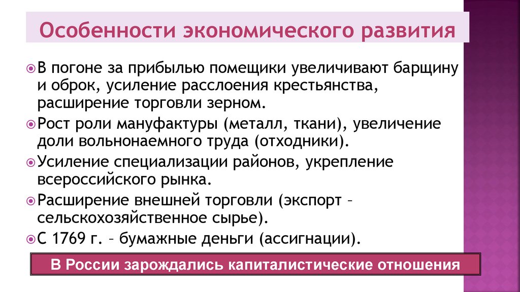 Особенности экономического развитияВ погоне за прибылью помещики увеличивают барщину