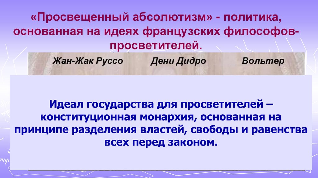 «Просвещенный абсолютизм» - политика,основанная на идеях французских философовпросветителей.