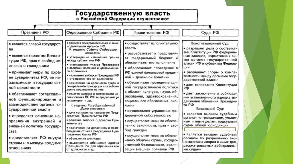 4. Разделение властей – разделение функций государства по трем ветвям власти – законодательной, исполнительной и судебной (горизонтальное разделение властей), а также разграничение предметов ведения и полномочий между двумя уровнями