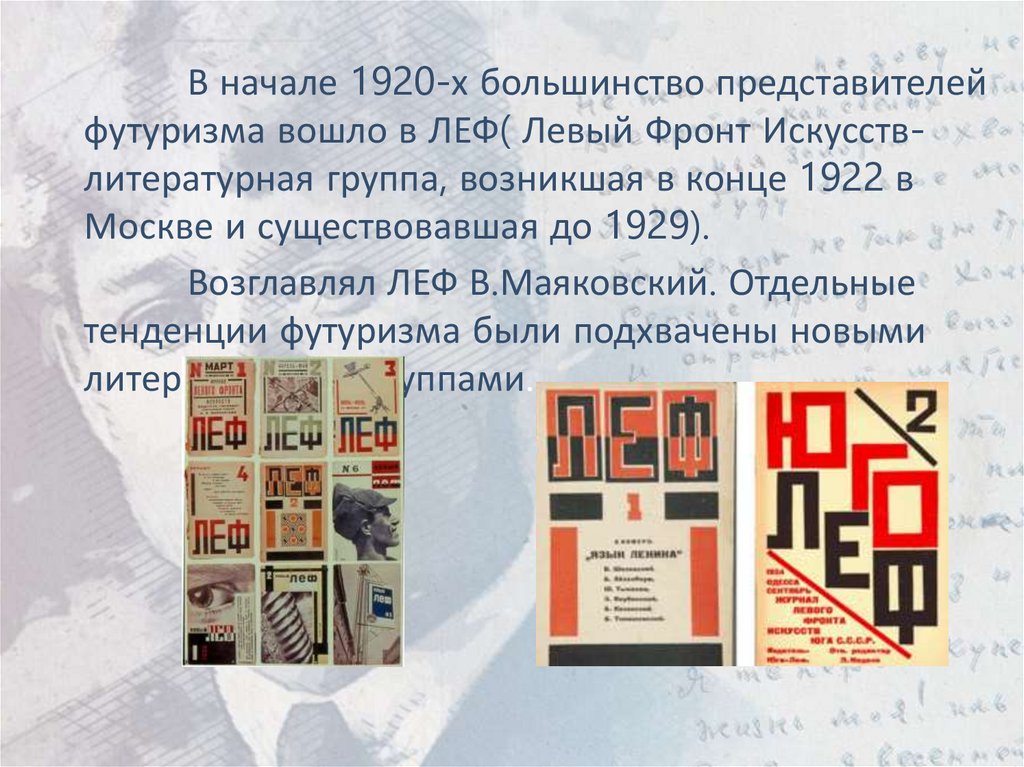 В начале 1920-х большинство представителейфутуризма вошло в ЛЕФ( Левый Фронт Искусствлитературная группа, возникшая в конце 1922 в
