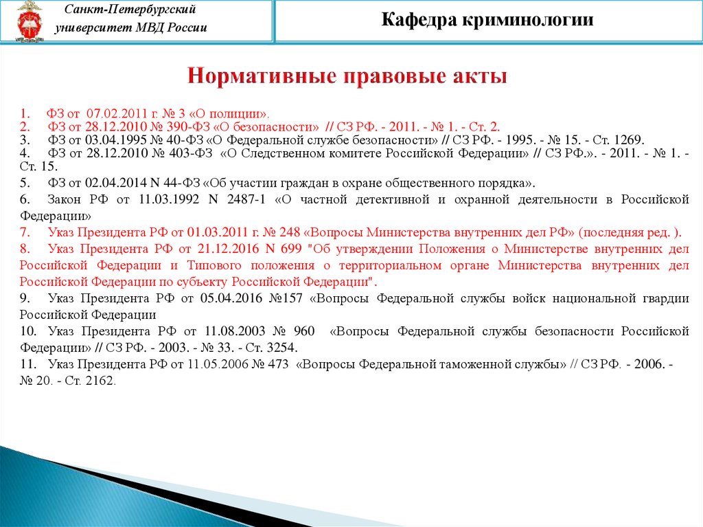 1. ФЗ от 07.02.2011 г. № 3 «О полиции».