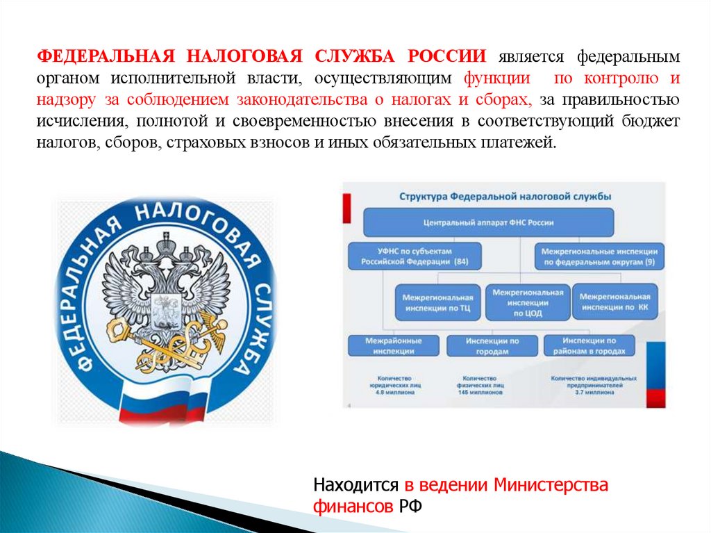 ФЕДЕРАЛЬНАЯ НАЛОГОВАЯ СЛУЖБА РОССИИ является федеральныморганом исполнительной власти, осуществляющим функции по контролю и