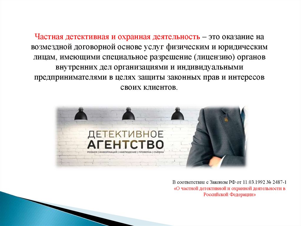 Частная детективная и охранная деятельность – это оказание навозмездной договорной основе услуг физическим и юридическим