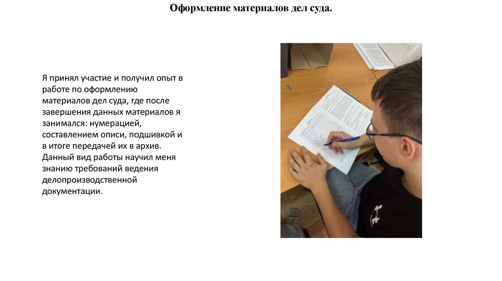 Оформление материалов дел суда.Я принял участие и получил опыт в