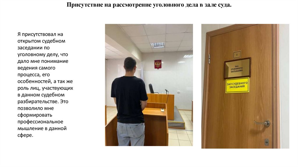 Присутствие на рассмотрение уголовного дела в зале суда.Я присутствовал на