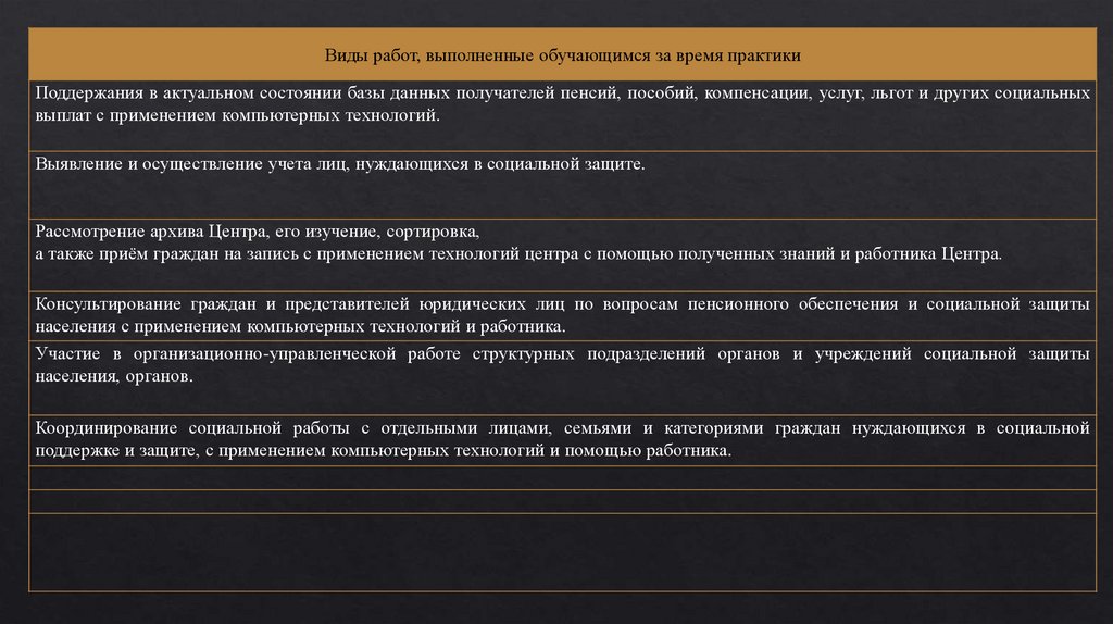 Виды работ, выполненные обучающимся за время практикиПоддержания в актуальном состоянии базы данных получателей пенсий, пособий, компенсации, услуг, льгот и других социальных