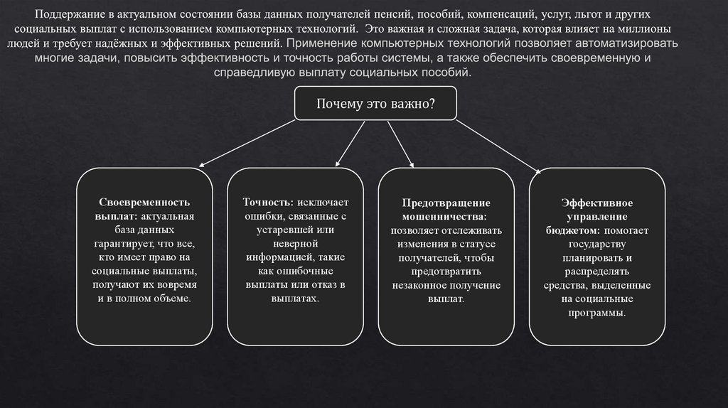 4. Поддержание в актуальном состоянии базы данных получателей пенсий, пособий, компенсаций, услуг, льгот и других социальных