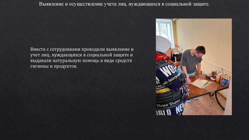 Выявление и осуществление учета лиц, нуждающихся в социальной защите.Вместе с сотрудниками проводили выявление и