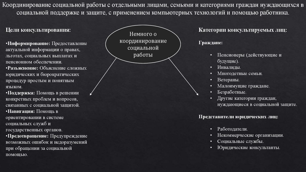 Координирование социальной работы с отдельными лицами, семьями и категориями граждан нуждающихся всоциальной поддержке и защите, с применением компьютерных технологий и помощью работника.